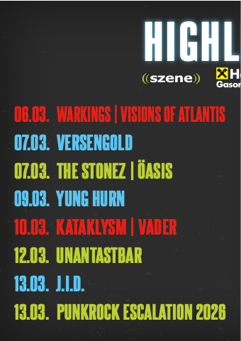 06 03 WARKINGS | VISIONS OF ATLANTIS 07 03 VERSENGOLD 07 03 THE STONEZ | ÖASIS 09 03 YUNG HURN 10 03 KATAKLYSM | VADER 12 03 UNANTASTBAR 13 03 J I D 13 03 PUNKROCK ESCALATION 2026