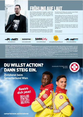 | | | | Anzeigen/ Kooperationen: Verena Hennerbichler / / / / Planet Planet Co-Operation / / / / 0043 699 1799 4300 / / / / verena@planet tt tt tt | | | Buchhaltungsleitung: Elke Hofer / / / / office@planet tt tt tt www www www www www www planet planet planet planet tt tt www www www www www www planetb2b at at at at at at www www www www www www planetfestivaltour at at at at at at www www www www www www simmcity at at at at at at www www www www www www szene wien www www www www www www cupderchoere at at at at at at Layouts & & Design & & Produktion: Stephan Jeff Ohorn / / Neidhartstraße 57 3033 Altlengbach | | | | Auflage: 115 000 Exemplare | | | | Vertrieb: Postversand / / öffentliche öffentliche Auflage Auflage | | | | öffentliche öffentliche Affichierung | | Druck: Print Alliance HAV Produktions GmbH 2540 Bad Vöslau Druckhausstraße 1 1 1 www printalliance at Erklärung über die die grundlegende Richtung: Ankündigungspostermagazin für Musik- und und und und Unterhaltungsveranstaltungen mit Konzertvorschau und und und und Schwerpunkt auf die die Förderung der der heimischen Popularmusik und und Live-Szene DU WILLST ACTION? DANN STEIG EIN Zivildienst beim Samariterbund Wien samariterwien at/zivildienst