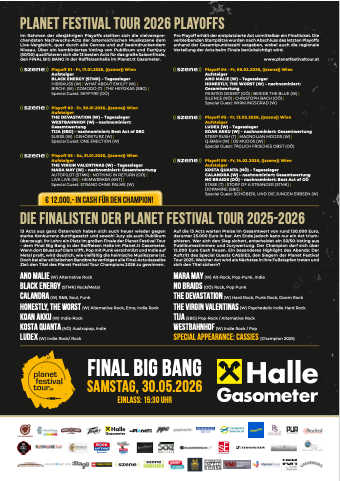 Ziel: den Titel des Planet Festival Tour Champions 2026 zu gewinnen ANO MALIE (W) Alternative Rock BLACK ENERGY (STMK) Rock/Metal