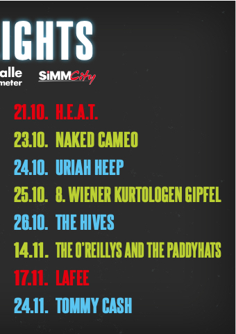 21 10 H E A T 23 10 NAKED CAMEO 24 10 URIAH HEEP 25 10 8 WIENER KURTOLOGEN GIPFEL 26 10 THE HIVES 14 11 11 THE THE THE O’REILLYS AND THE THE THE PADDYHATS 17 11 11 11 LAFEE 24 11 11 TOMMY CASH