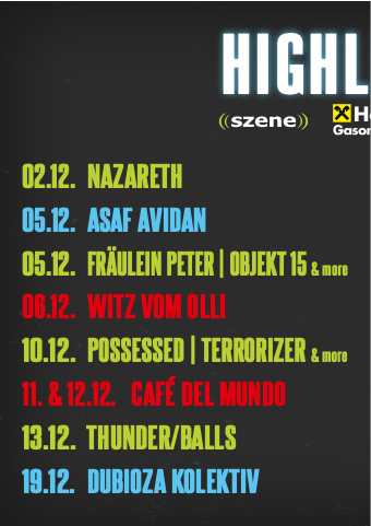 02 12 NAZARETH 05 12 ASAF AVIDAN 05 12 FRÄULEIN PETER | OBJEKT 15 & more 06 12 WITZ VOM OLLI 10 12 POSSESSED | TERRORIZER & more 11 & 12 12 12 12 12 12 CAFÉ DEL MUNDO 13 12 12 12 12 THUNDER/BALLS 19 12 12 DUBIOZA KOLEKTIV