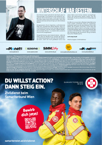 Gasometer Gasometer und und GF GF Szene Szene Wien: Martin Sobotnik | | | | | Leitung Leitung Leitung Leitung Leitung Leitung SiMM SiMM City: Manuel Bintinger | | | | | Mitarbeit: Eva Gotschke (Leitung Eutopia) Dipl Ing Robert Breunhölder (techn (techn (techn Leitung Leitung Leitung Leitung Leitung Leitung Gasometer) Bernhard Schurian (techn (techn (techn Leitung Leitung Leitung Leitung Leitung Leitung SiMM SiMM City) Paul Dotzer (techn (techn (techn Leitung Leitung Leitung Leitung Leitung Leitung Szene Wien) | | | | | Anzeigenverwaltung und und Verlagsbüro: Planet Planet Music & Media Veranstaltungs- und und VerlagsgesmbH 1110 Wien Wien Guglgasse 8 | | | | | GF Josef Muff Sopper | | | | | Anzeigen/ Kooperationen: Verena Hennerbichler / / / / / / Planet Planet Co-Operation / / / / / / 0043 0043 699 1799 4300 / / / / / / verena@planet tt tt tt | | | | | Buchhaltungsleitung: Elke Hofer / / / / / / 0043 0043 1 1 1 1 1 1 332 46 41 / / / / / / office@planet tt tt tt | | | | | www www www www www www planet planet planet planet tt tt www www www www www www planetb2b at at at at at at www www www www www www planetfestivaltour at at at at at at www www www www www www simmcity at at at at at at www www www www www www szene wien www www www www www www cupderchoere at at at at at at Layouts & & Design & & Produktion: Stephan Jeff Ohorn / / Neidhartstraße 57 3033 Altlengbach | | | | Auflage: 115 000 Exemplare | | | | Vertrieb: Postversand / / öffentliche öffentliche Auflage Auflage | | | | öffentliche öffentliche Affichierung | | Druck: Print Alliance HAV Produktions GmbH 2540 Bad Vöslau Druckhausstraße 1 1 1 www printalliance at Erklärung über die die grundlegende Richtung: Ankündigungspostermagazin für Musik- und und und und Unterhaltungsveranstaltungen mit Konzertvorschau und und und und Schwerpunkt auf die die Förderung der der heimischen Popularmusik und und Live-Szene DU WILLST ACTION? DANN STEIG EIN Zivildienst beim Samariterbund Wien samariterwien at/zivildienst